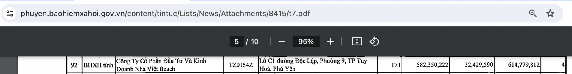 Công ty CP Đầu tư và Kinh doanh Nhà Việt Beach nợ đóng BHXH, BHYT, BHTN cho 171 lao động đã 4 tháng với số tiền là hơn 614 triệu đồng. Ảnh PV chụp màn hình công bố BHXH tỉnh Phú Yên và website.