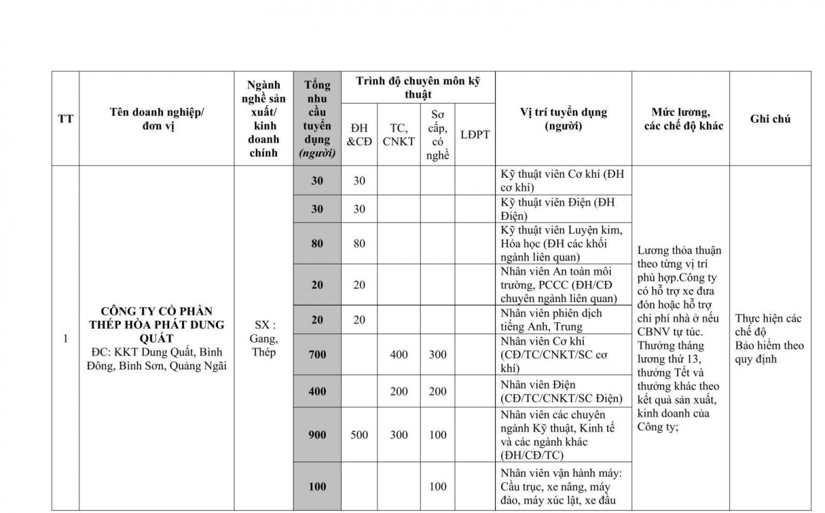 Trong các công ty tuyển dụng đã nêu, Công ty CP Thép Hòa Phát Dung Quất tuyển dụng nhân sự quy mô lớn nhất. Nhu cầu tuyển dụng của Hòa Phát Dung Quất trải rộng trên nhiều lĩnh vực và trình độ, từ kỹ thuật viên có trình độ đại học đến lao động phổ thông được đào tạo nghề.