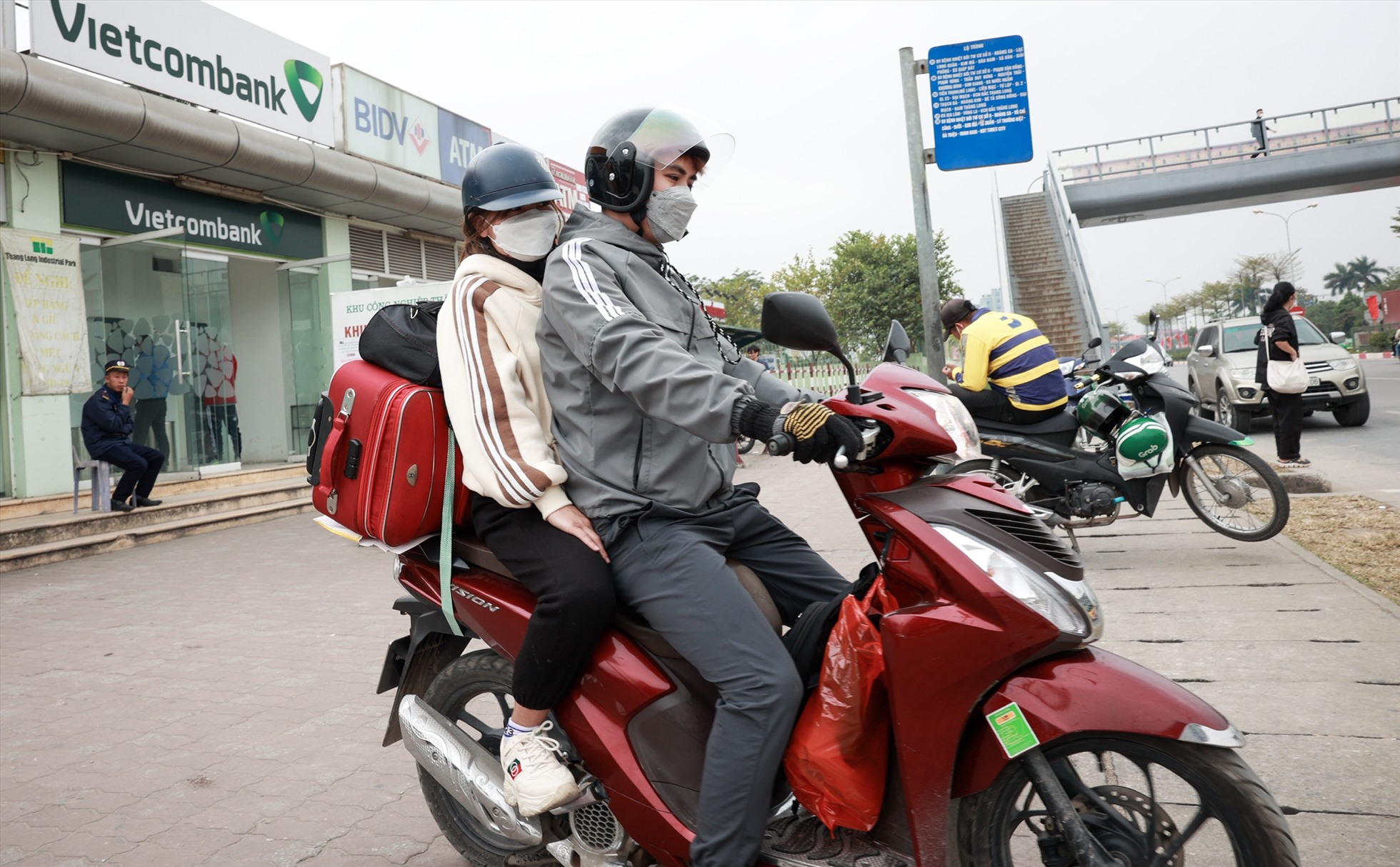 Sau khi rút 3 triệu đồng, vợ chồng anh Đinh Xuân Thành và Đặng Thị Thu lên xe máy về luôn quê ở Phú Thọ. Anh Thành làm nghề tự do, còn chị Thu làm công nhân khu công nghiệp. Do mới làm được 3 tháng, nên chị Thu chưa có thưởng Tết. Ảnh: Hải Nguyễn
