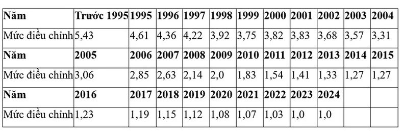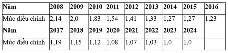 Trong đó, mức điều chỉnh tiền lương đã đóng BHXH của năm tương ứng được thực hiện theo bảng 1 dưới đây: