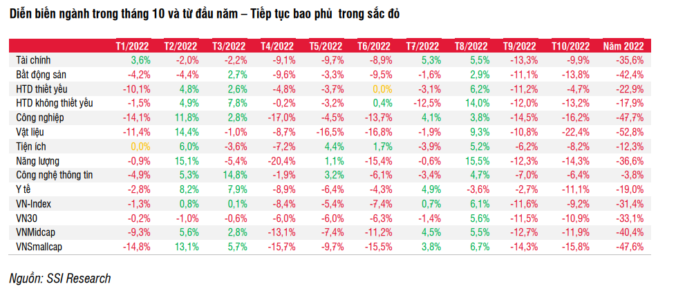 Tương tự tháng 9, toàn thị trường chìm trong sắc đỏ khiến các chỉ số vốn hóa thành phần cũng lùi sâu như chỉ số VN30 giảm 10,9%, chỉ số VNMidcap giảm 11,9% còn chỉ số VNSmallcap giảm 15,8%. Tính từ đầu năm, TTCK Việt Nam có mức giảm 31,7% trên chỉ số VNIndex; đây là mức giảm mạnh nhất trong nhiều năm trở lại đây chỉ sau mức giảm 66% ở năm 2008.