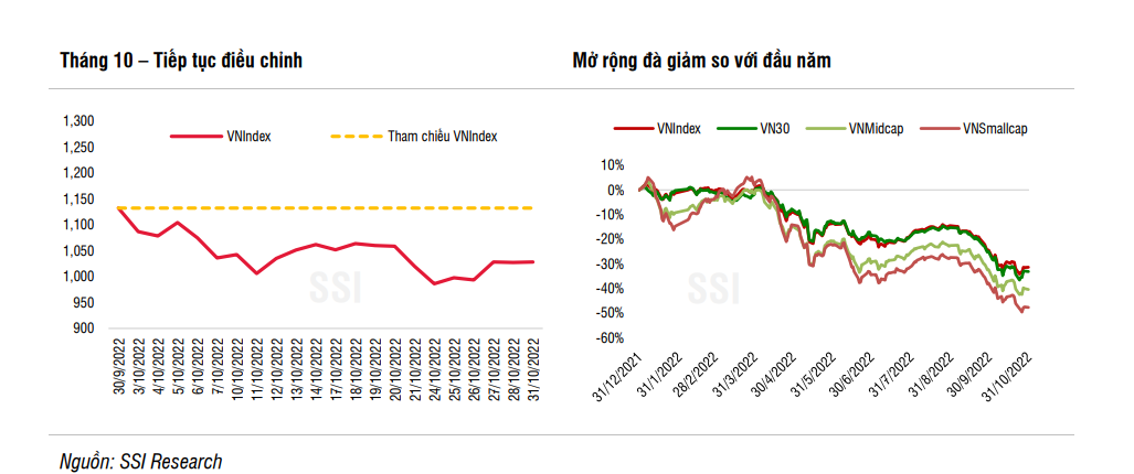 Chỉ số VN-Index biến động hoàn toàn dưới vùng tham chiếu trong tháng 10 và có 3 phiên đóng cửa xuyên thủng mốc tâm lý 1.000 điểm vào các ngày 24, 25 và 26/10. Một nhịp hồi phục nhẹ sau đó giúp chỉ số quay lại trên mốc 1.000 điểm và đóng cửa phiên cuối tháng tại mốc 1.027,94 điểm, giảm 104,17 điểm tương đương 9,2%.