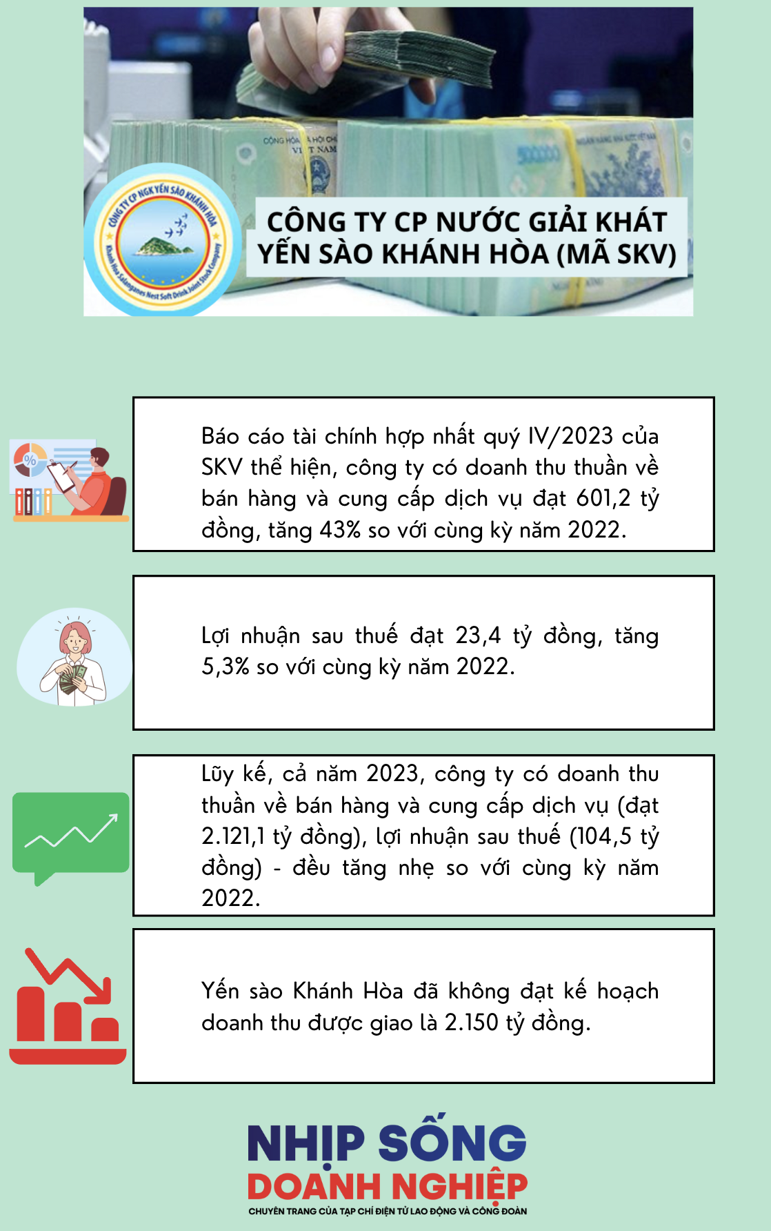 Năm 2023, Công ty CP Nước giải khát Yến sào Khánh Hòa (mã chứng khoán SKV) có doanh thu là 2.121,1 tỷ đồng, không hoàn ... |