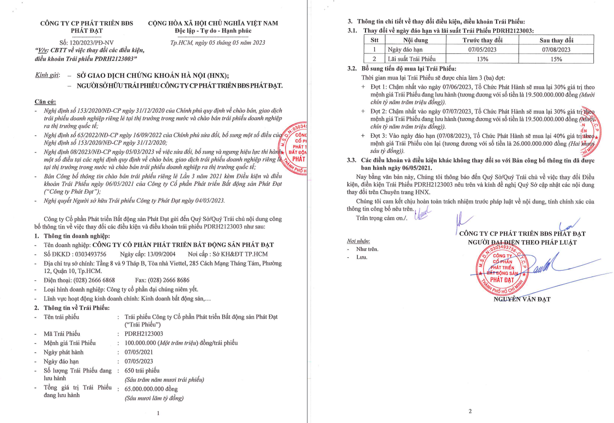 Đợt 2, chậm nhất vào ngày 07/07/2023, Phát Đạt sẽ mua lại 30% giá trị theo mệnh giá trái phiếu đang lưu hành, tương đương với 19,5 tỷ đồng.